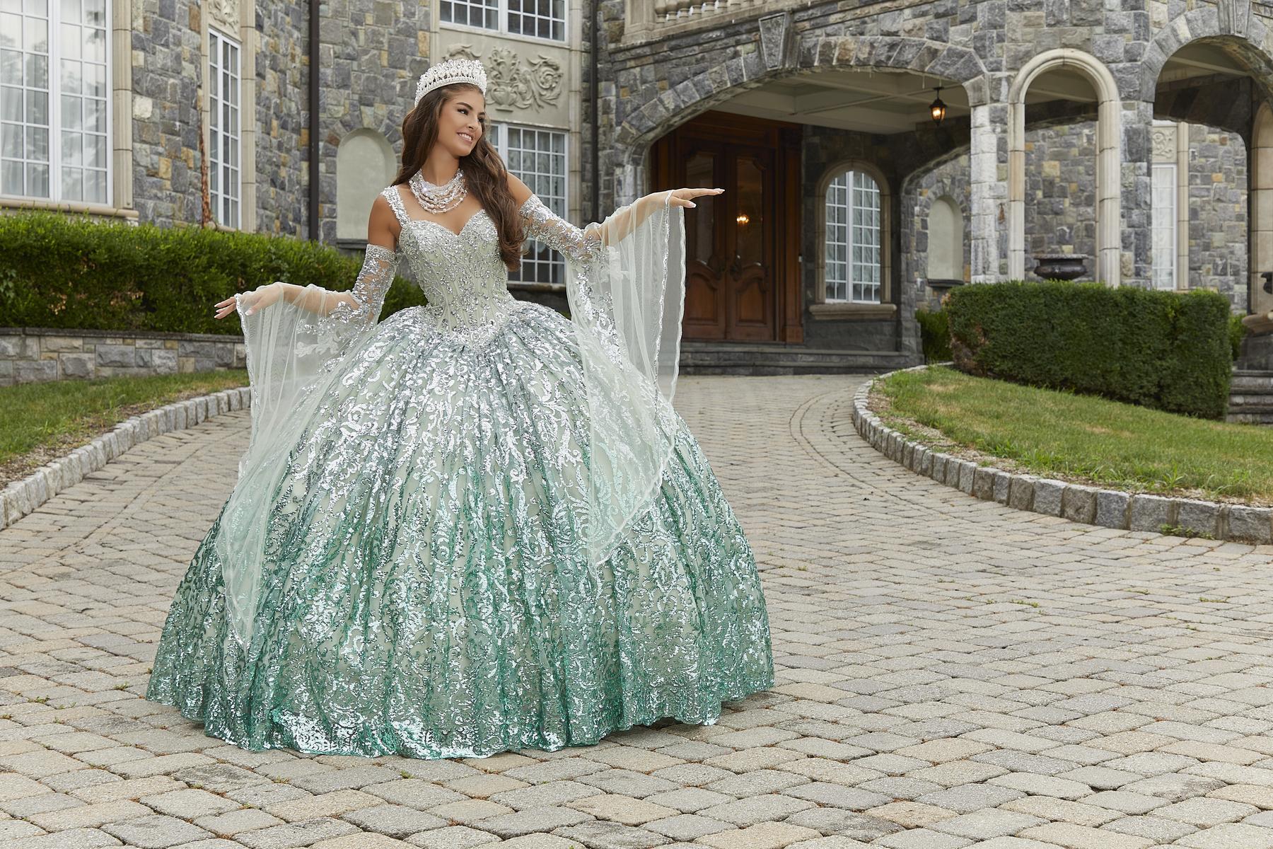 Glistening quinceanera ball gown has blingy crystal beaded on ombre patterned sequins over glitter tulle. The boned corset bodice has a romantic sweetheart neckline and with added details like the detachable, oversized bell sleeves and back this dress is a stand out. Matching bolero jacket included.