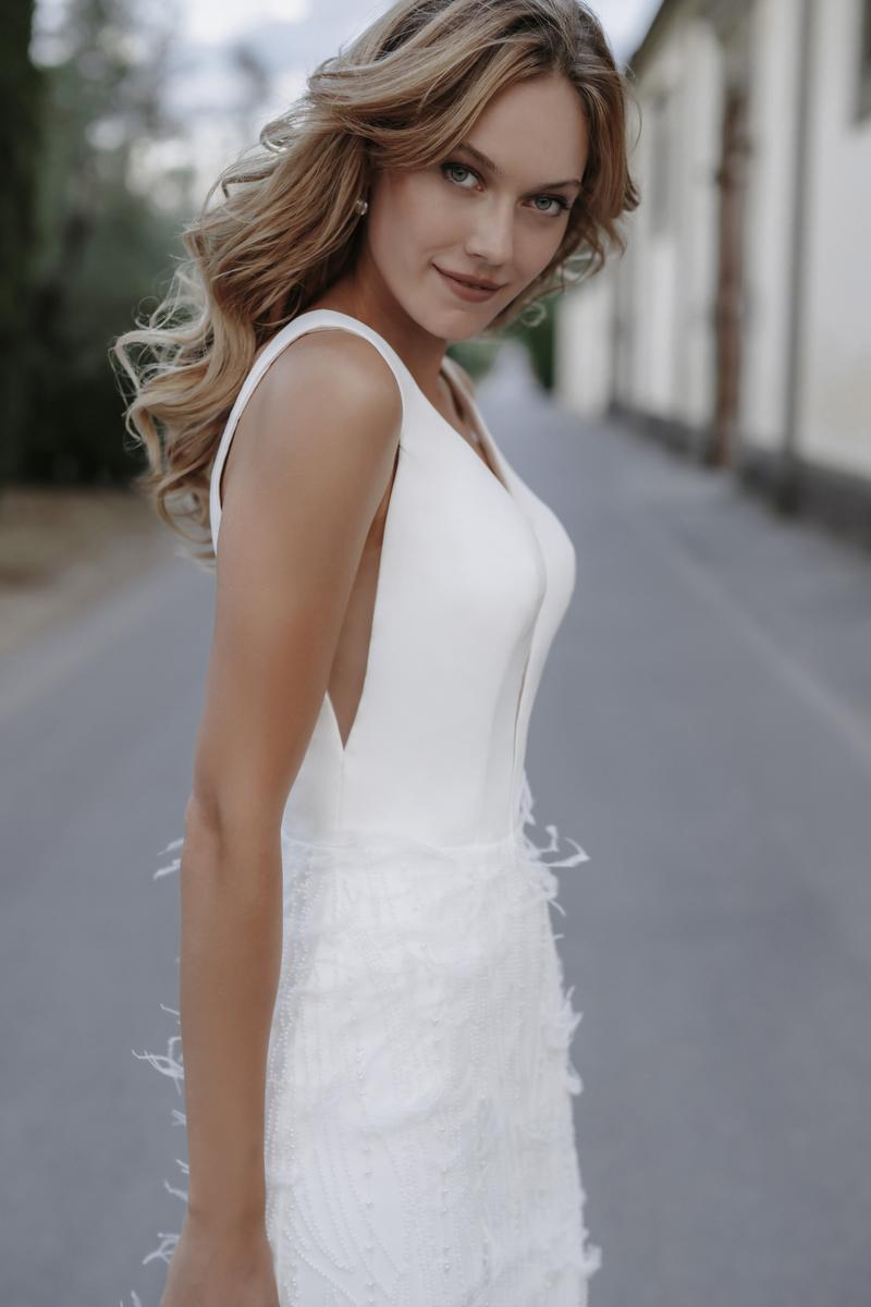 The name of this style is ShirinAccented with detachable sleeves and dimensional lace blossoms, Jouri is crafted from glittering tulle in a classic A-line silhouette.Refer to measurements for Size Chart B