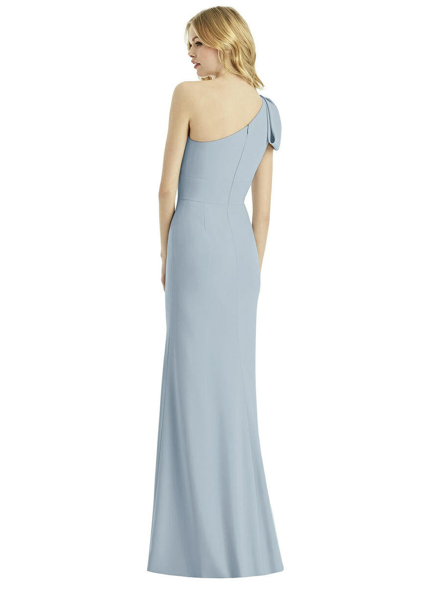 Bowed One-Shoulder Trumpet GownFull length one shoulder crepe princess line gown with modified bow detail at shoulder and matching inset waistband at natural waist. Slit at side front of trumpet skirt.IMPORTANT INFORMATION REGARDING the "In Stock" indicator on this collectionWhen you see "In Stock" tagged on a style in this collection this indicates that we have this style/color/size in our store for you to see and that you can try it on if you visit our store. The dresses from this collection that are in our store are "Samples" and are not available for purchase.All style/sizes/colors in this collection must be special ordered and can usually be shipped in 9 weeks.