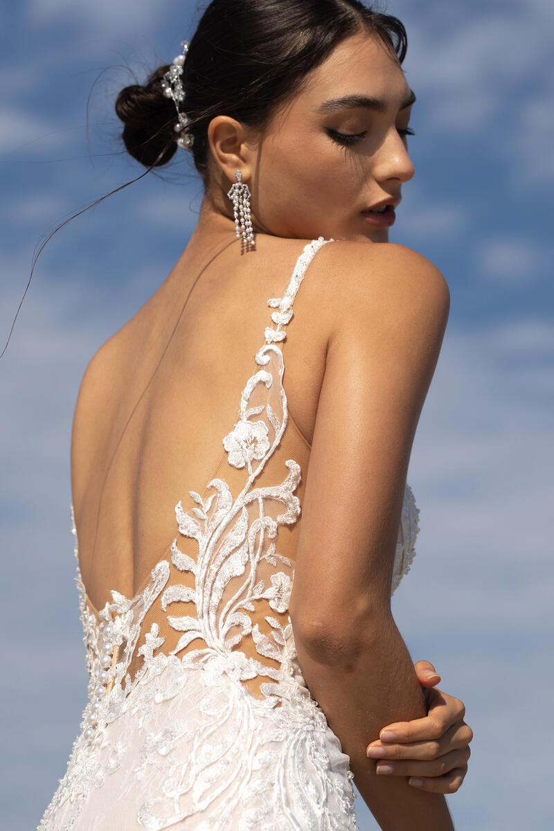 Aura CollectionStyle Evita features a fully lined bodice with a sparkle lace sheath silhouette. The delicate shoulder straps and embroidered double train make this gown a showstopper.
