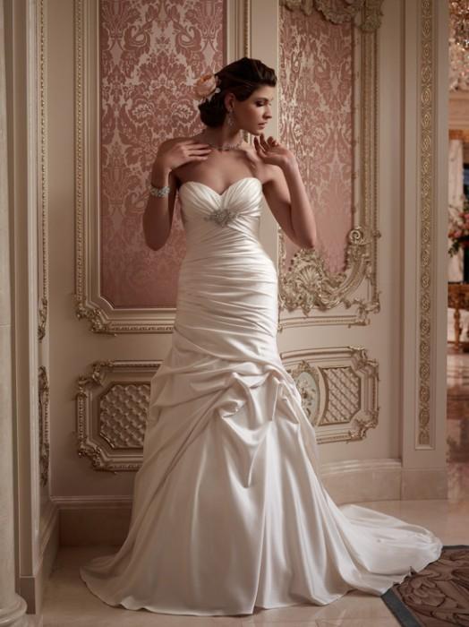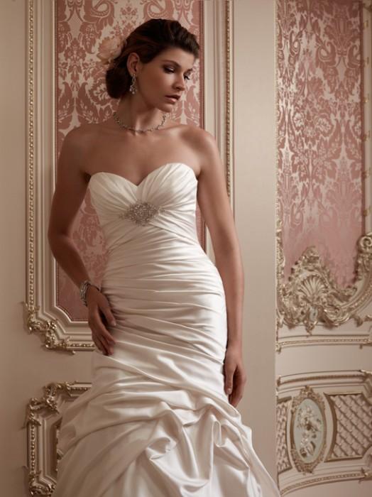 Ruched, Perfecting Satin sweetheart neckline is accented on the front bodice with a crystal and pearl beaded appliqu. Matching fabric covered buttons with loops line the zipper of this flit and flare gown.