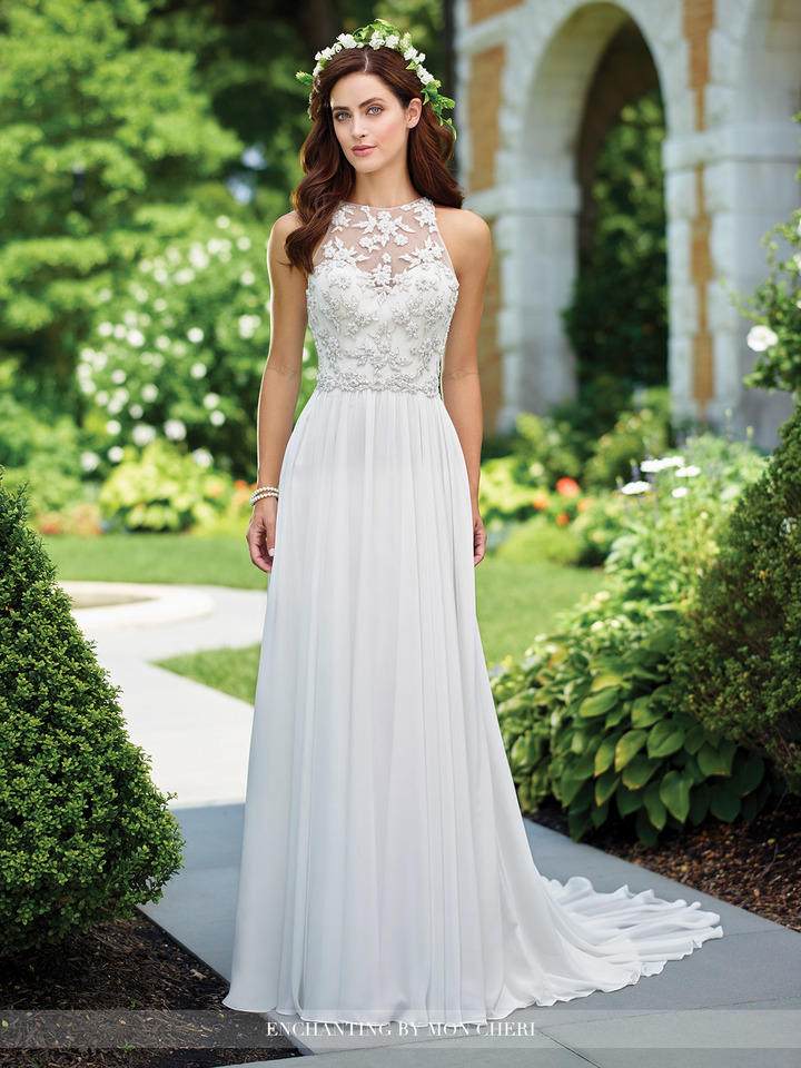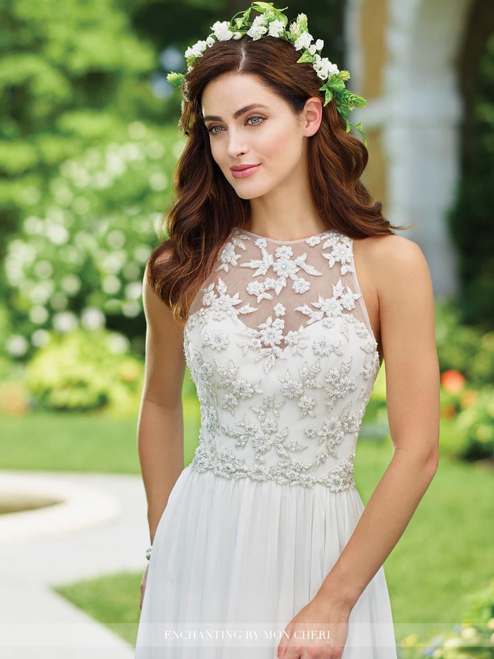 Sleeveless chiffon A-line gown with hand-beaded illusion high jewel neckline, hand-pattern beaded sweetheart bodice with natural waist, beaded illusion keyhole back, softly gathered skirt with chapel train.