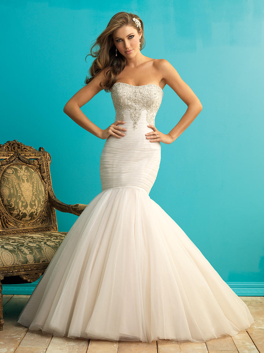 Layers of soft English net tuck throughout the entire bodice and are accented by crystalline beading across the bodice.