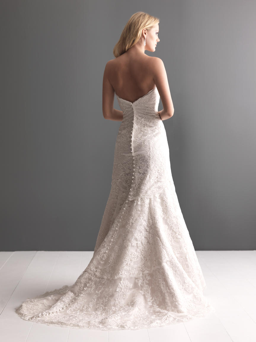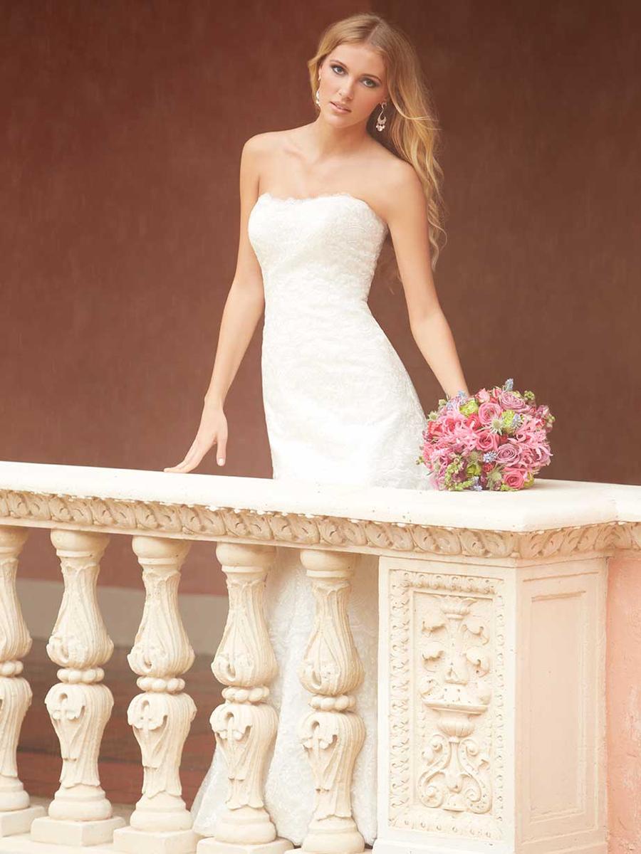 This fitted, A-line gown is lovely in our all over lace. The strapless neckline is slightly scooped for a flattering effect. Delicate hem lace is layered throughout the entire design to create a rich and luxurious feel.