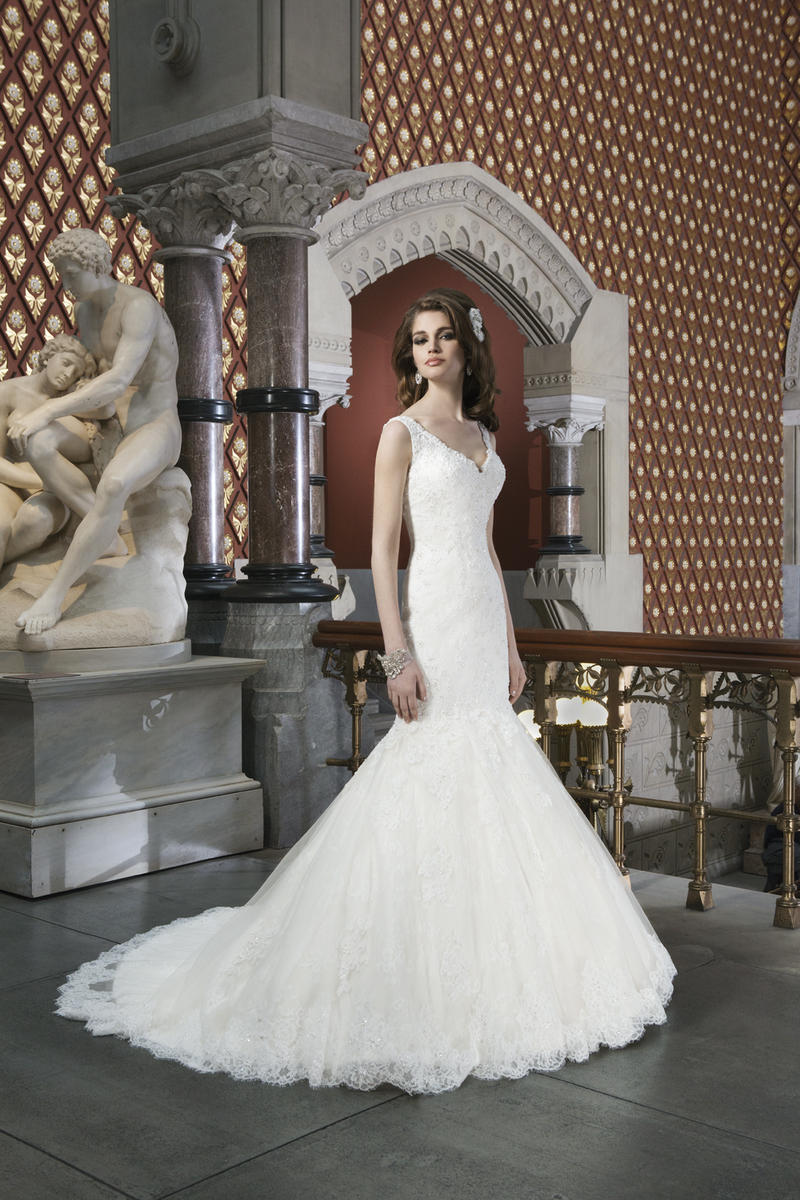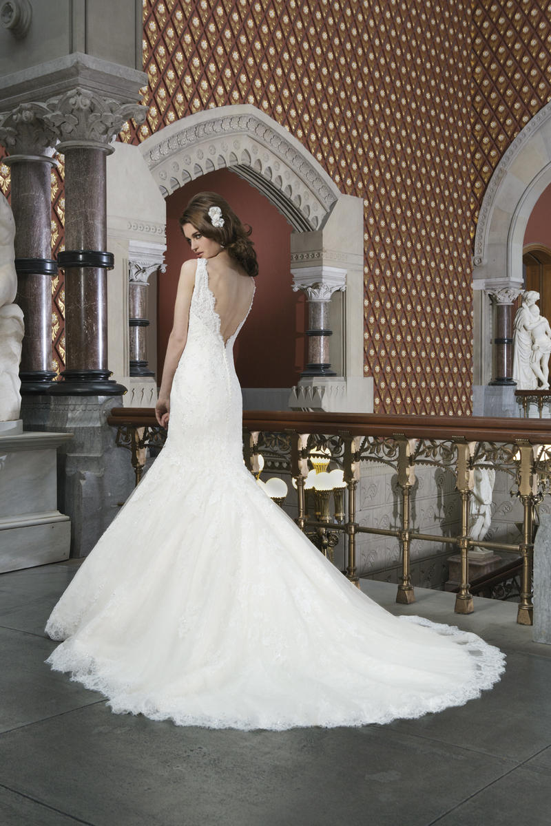 Beaded Alencon lace appliques accent the chantilly lace mermaid silhouette that features a V-tank neckline. Back is finished with a deep V- neckline, chapel length train and regal satin buttons that cover the back zipper.