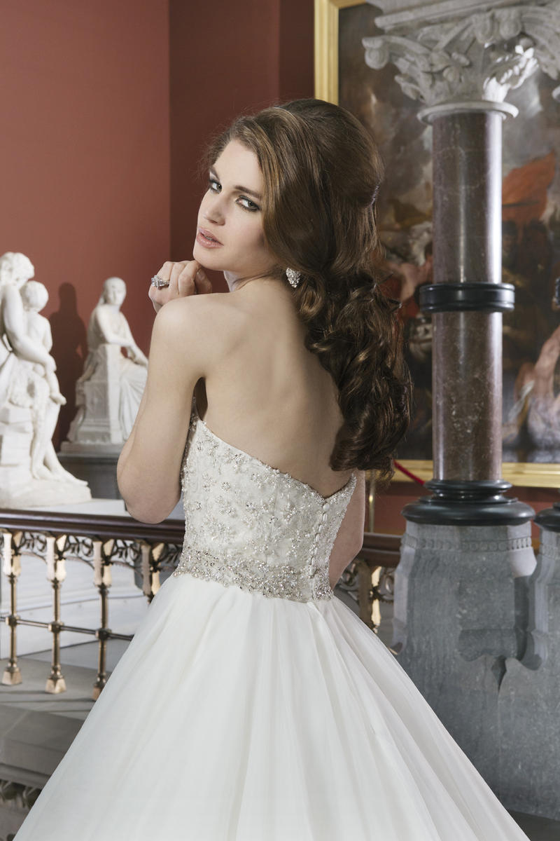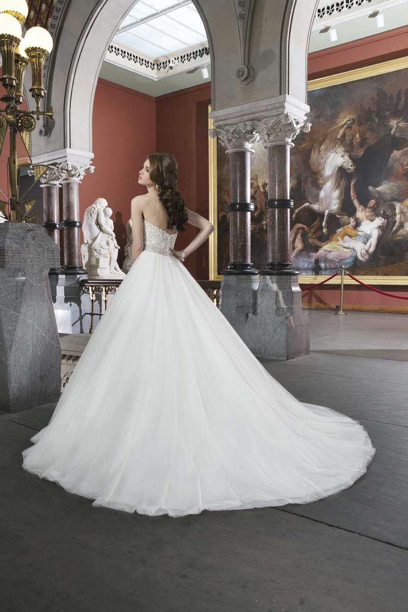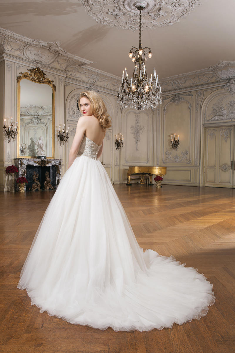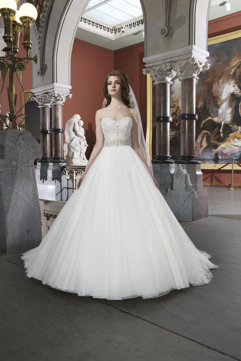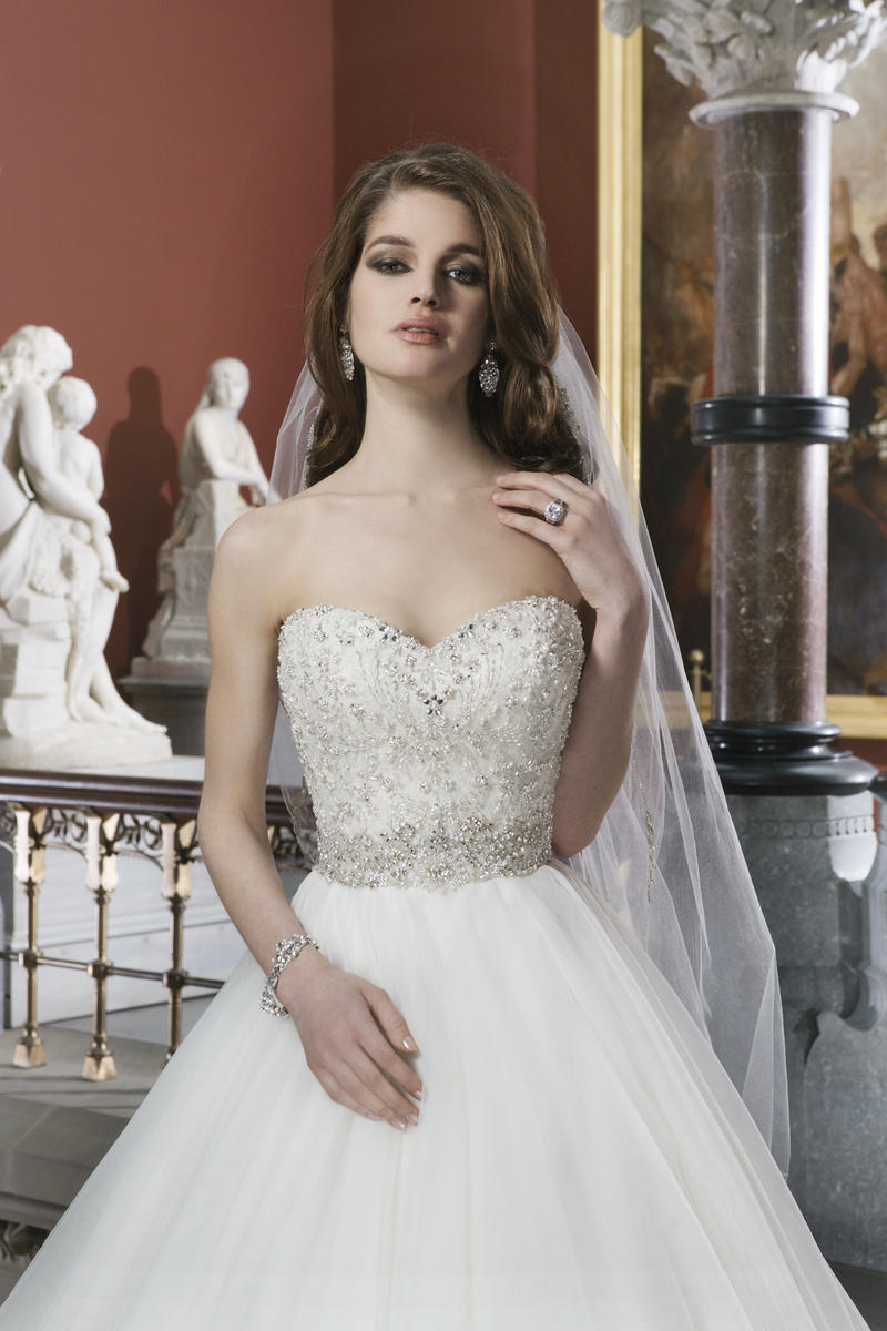 Tulle ball gown features intricately beaded bodice with a sweetheart neckline. Style has a chapel length train and regal satin buttons to cover the back zipper. This style includes an attached beaded belt at the natural waistline.
