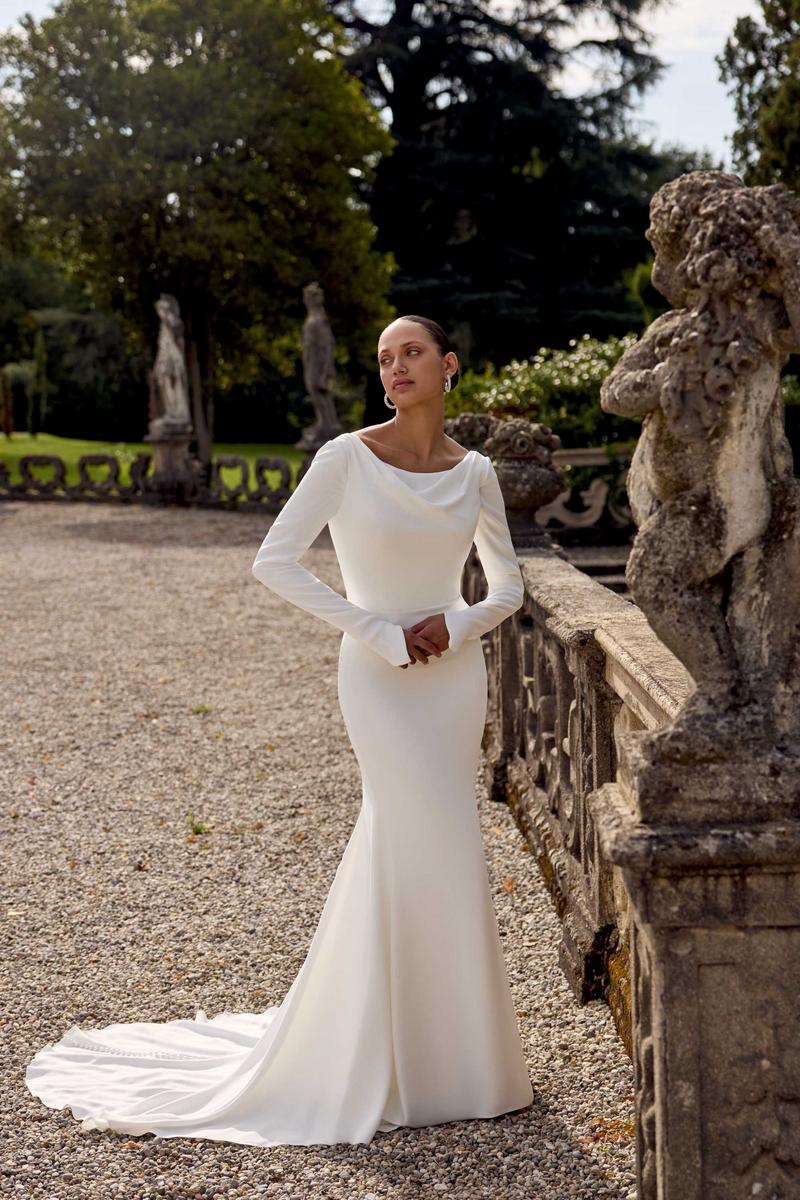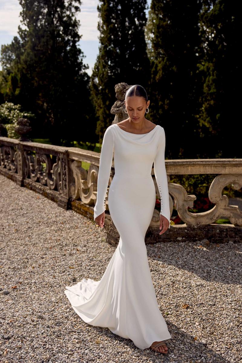 This is our Kathleen style. The fabric in this Stretch Crepe Fit and Flare Gown with High Cowl Neckline and Low Back Justin Alexander wedding dress is Jersey Lining, Crepe