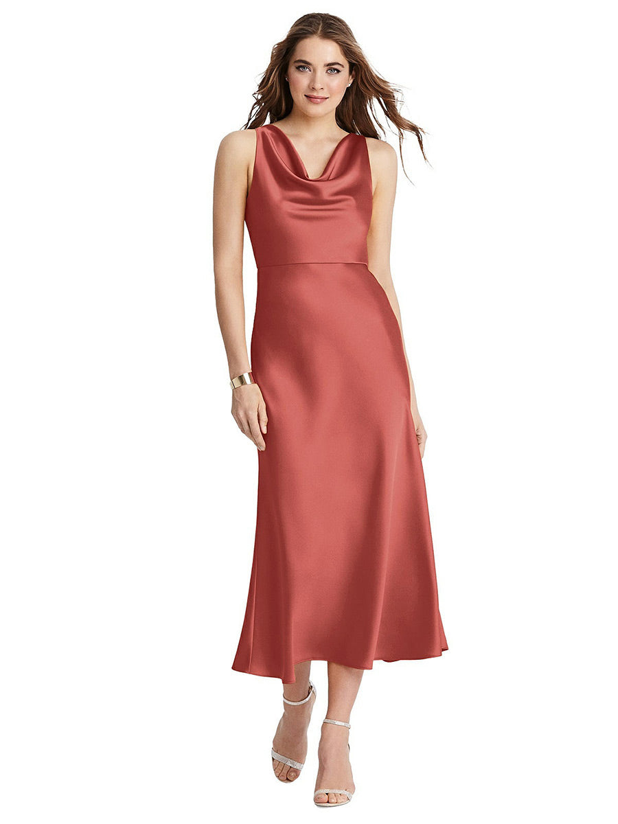 Cowl-Neck Midi Tank Dress - EsmeLux charmeuse midi length cowl neck dress with tank style straps and bias skirt. Natural waistline.IMPORTANT INFORMATION REGARDING the "In Stock" indicator on this collectionWhen you see "In Stock" tagged on a style in this collection this indicates that we have this style/color/size in our store for you to see and that you can try it on if you visit our store. The dresses from this collection that are in our store are "Samples" and are not available for purchase.All style/sizes/colors in this collection must be special ordered and can usually be shipped in 9 weeks.