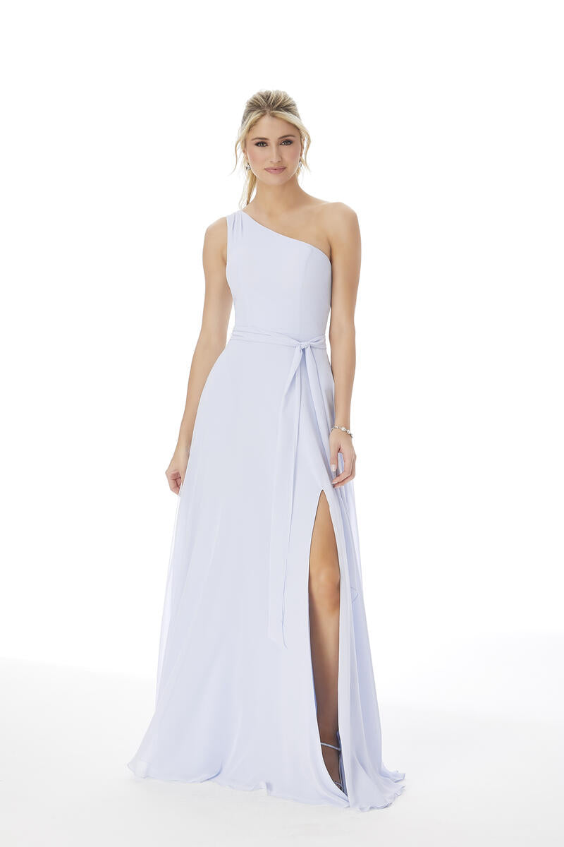 Chiffon bridesmaid dress with one shoulder neckline and chiffon tie belt at waist. Shown in eggplant and fog. Available in select chiffon colors.