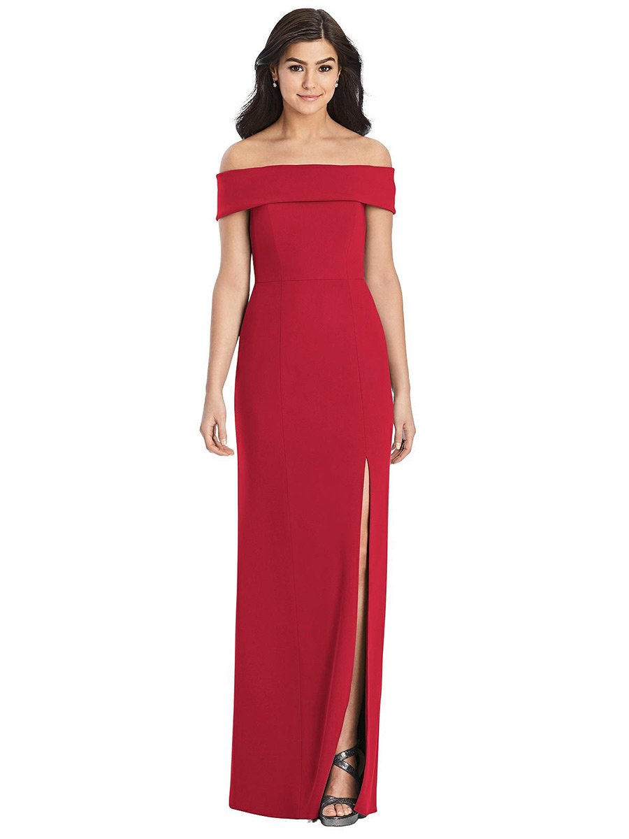 Cuffed Off-the-Shoulder Trumpet GownFull length off the shoulder crepe dress w/ cuff detail at neckline. Natural waistline. Trumpet skirt w/ slit at side front.IMPORTANT INFORMATION REGARDING the "In Stock" indicator on this collectionWhen you see "In Stock" tagged on a style in this collection this indicates that we have this style/color/size in our store for you to see and that you can try it on if you visit our store. The dresses from this collection that are in our store are "Samples" and are not available for purchase.All style/sizes/colors in this collection must be special ordered and can usually be shipped in 9 weeks.