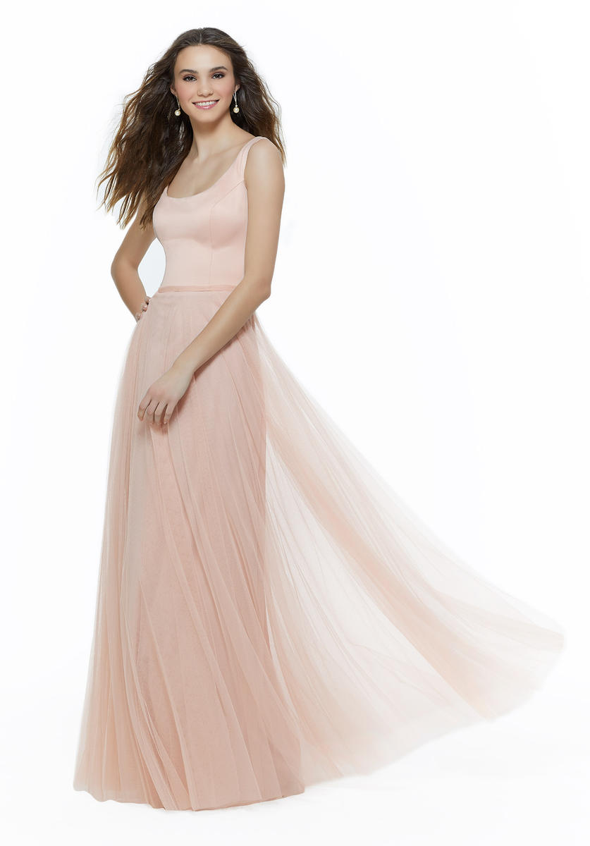 Satin and English Net bridesmaid dress featuring a scoop neck and scoop back satin bodice with natural waist. A-line skirt with English Net overlay. View Satin swatch card for color options.