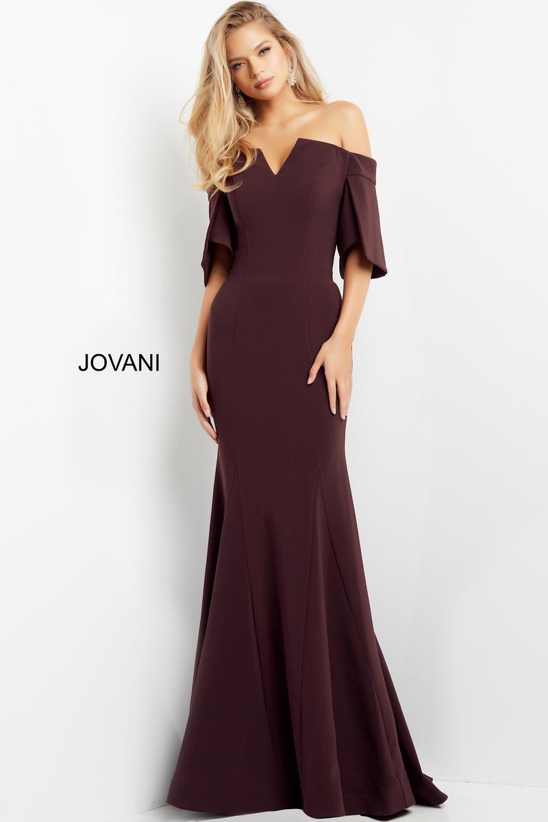 Jovani 04341 Plum Off the Shoulder Sheath Evening Dress