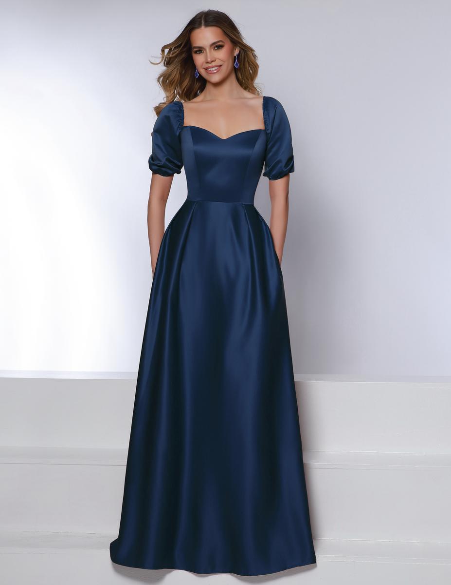 The color pictured for this style is NavyThe fabric in this Kanali K Bridesmaids style is SatinAll styles are available in regular and Jr. bridesmaids sizes. If this style is available in two-tone, please select your color choice for the dress from the color pull down menu and advise your color choice for the trim when placing your order.