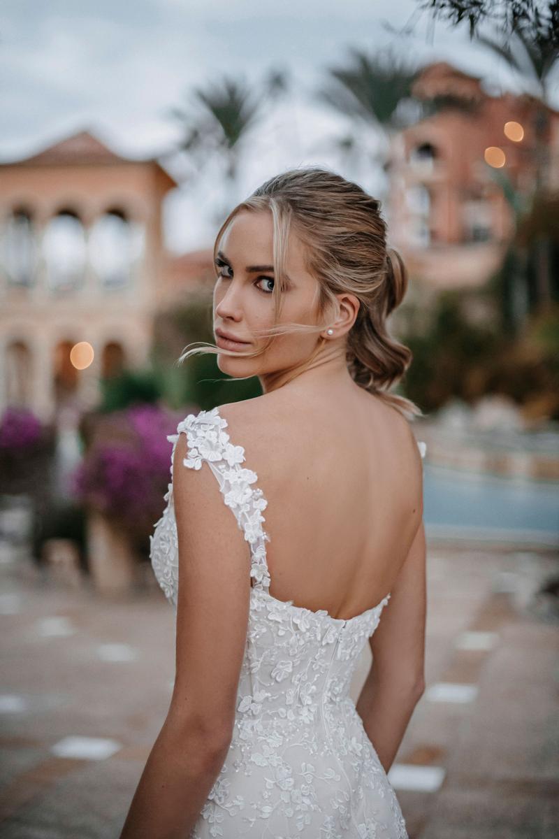 Subtle exposed boning and textured blooms lend both modernity and elegance to the Monika gown.Refer to measurements for Size Chart B