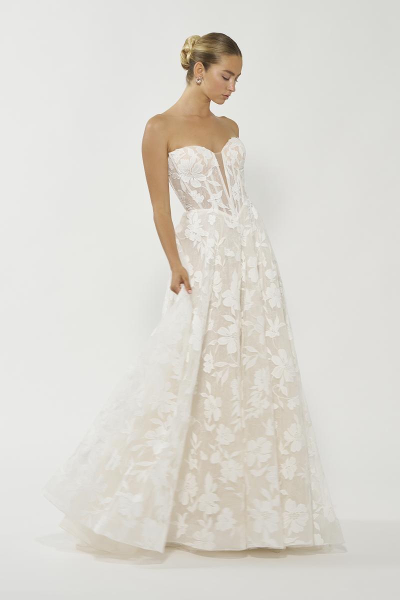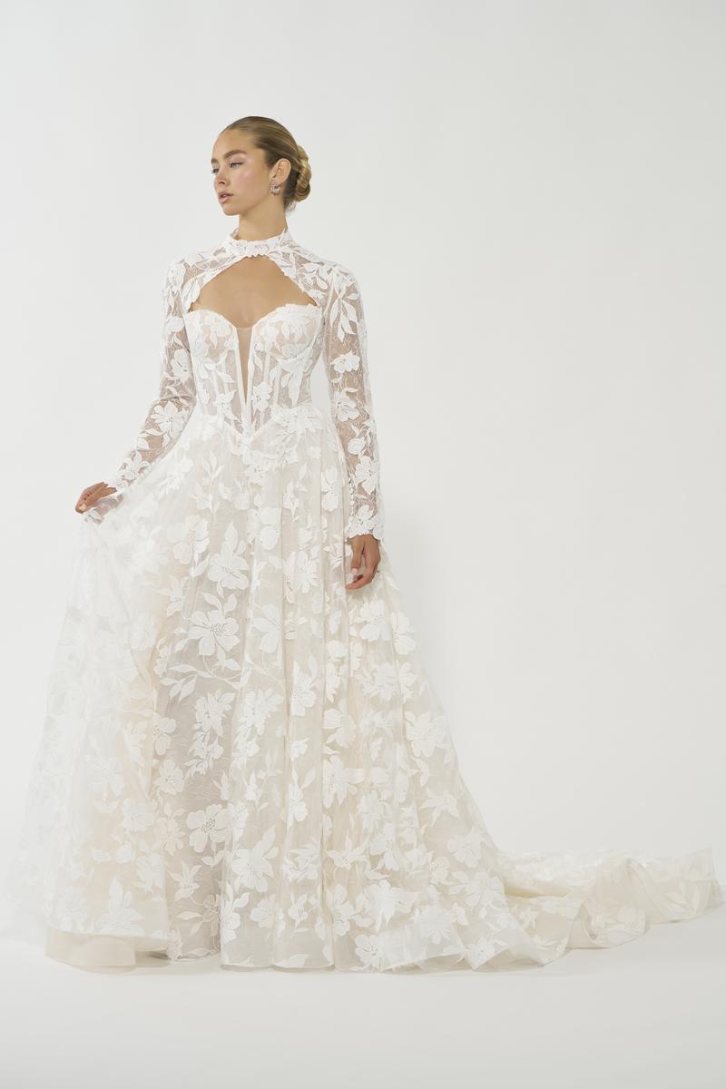 Sizes with an S are 4 inches shorter in lengthTheDevingown is a romantic A-line silhouette crafted from airy tulle and delicate Chantilly lace. Its sheer corset bodice, detailed with lace appliques and a flattering basque waist, offers a blend of structure and softness. A strapless sweetheart neckline enhances the timeless design, while the optional long-sleeve lace jacketsold separatelyadds versatility and a touch of classic elegance.Refer to measurements for Size Chart B
