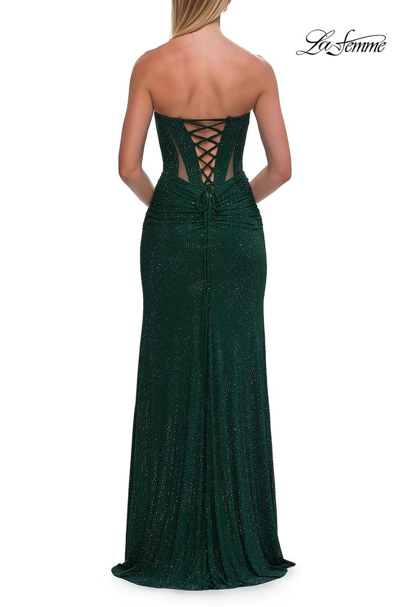 The fabric in this La Femme Prom style is Hot Stone Net Jersey