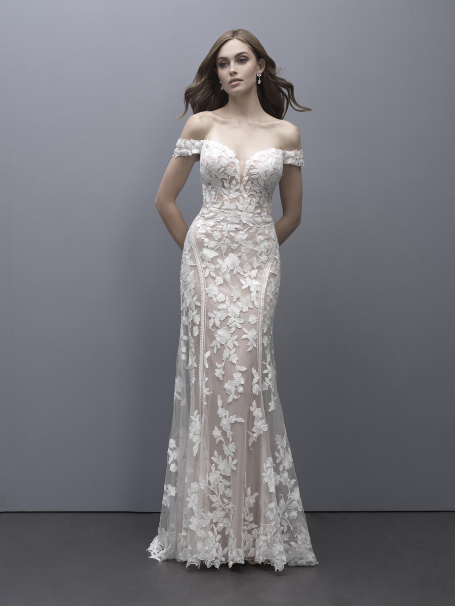 Sizes with an S are 4 inches shorter in lengthHigh contrast lace appliqus cover this elegant off-shoulder sheath gown.Refer to measurements for Size Chart B