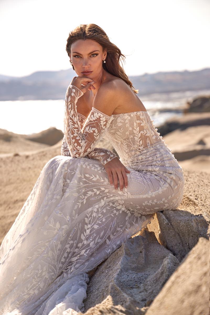 Sizes with an S are 4 inches shorter in lengthTheDakotahgown captivates with its effortless shimmer and graceful detailing. Designed in luminous sparkle tulle, this sheath silhouette features soft leafy lace and subtle tonal beading that catch the light with every movement. A romantic sweetheart neckline and sheer bodice lend a modern allure, while optional detachable sleevessold separatelyallow for a personalized touch.Dakotahis the perfect balance of ethereal charm and sleek sophistication.Refer to measurements for Size Chart B