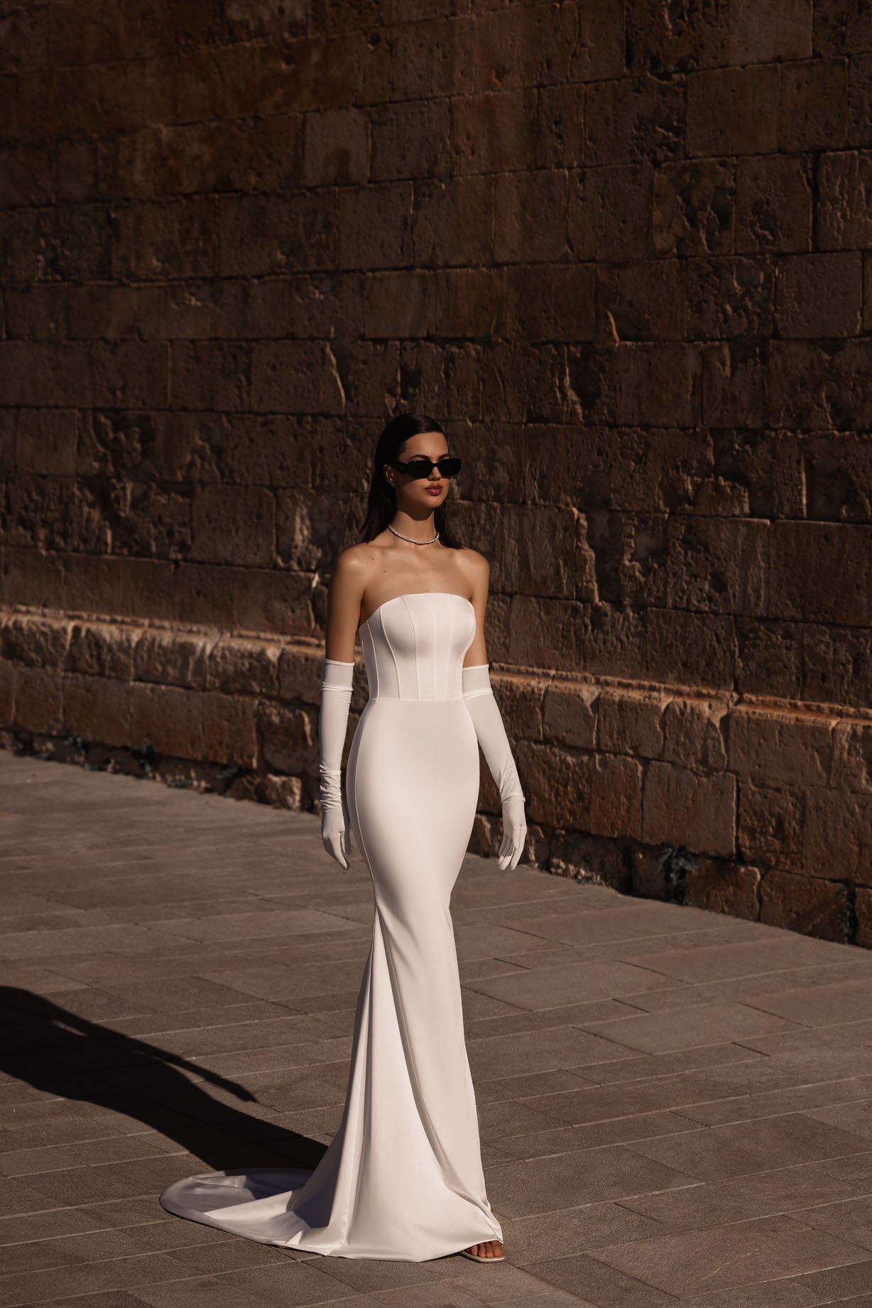 Introducing our stunning mermaid wedding dress, a true embodiment of timeless beauty and modern elegance. Crafted from luxurious glossy fabric, this dress showcases a strapless corset with a sleek straight across neckline, exuding grace and sophistication. The detachable bow-sleeves add a touch of romance and versatility, allowing you to personalize your look for different moments throughout your special day. And for an extra touch of glamour, the detachable puffy tulle overskirt floats gracefully, creating a dreamy and ethereal effect as you walk down the aisle. With its exquisite details and flattering silhouette, this dress is designed to make you feel like a true princess on your wedding day.