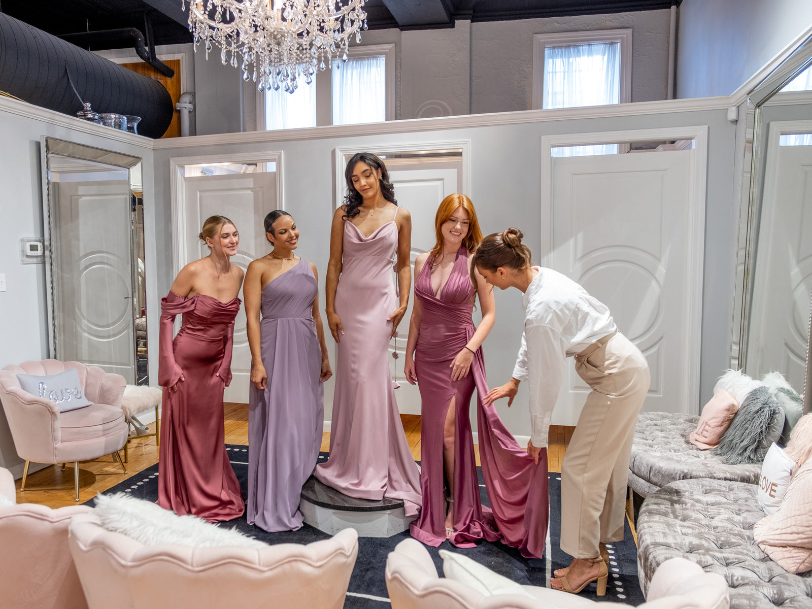 Our specialists come highly trained in preparing your ensemble, whether your vision includes mix-and-match, mixed colors, or identical gowns. Each 1–2 hour appointment includes space for your entire bridal party.