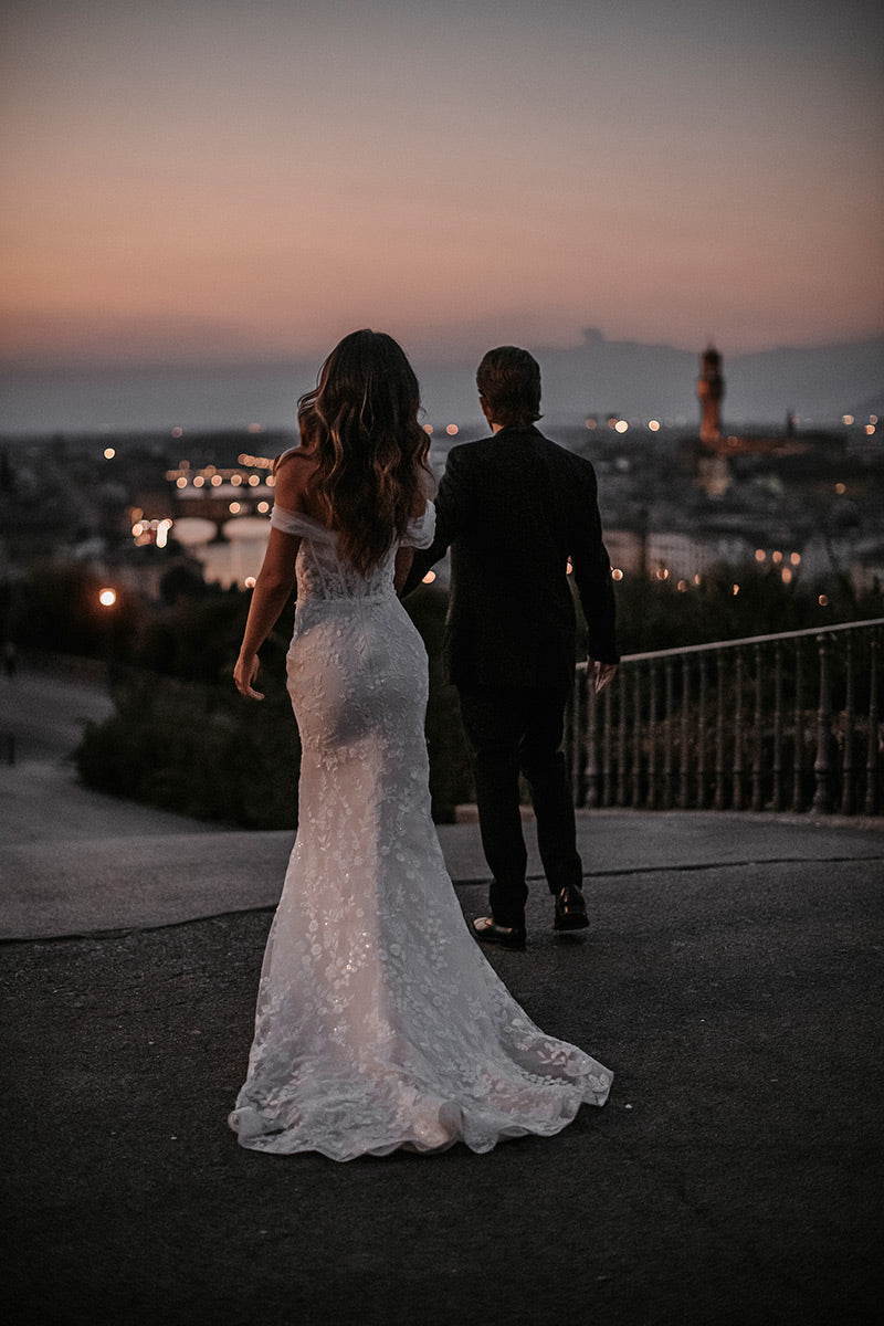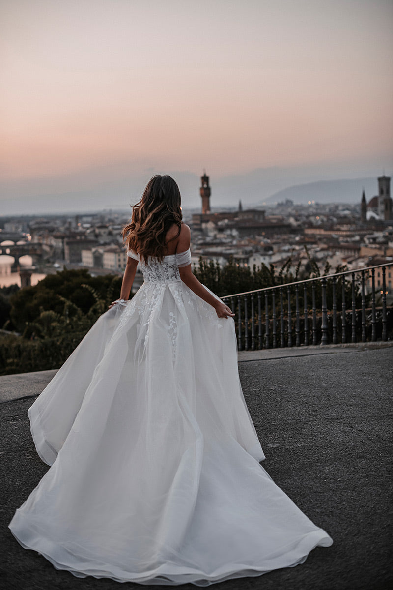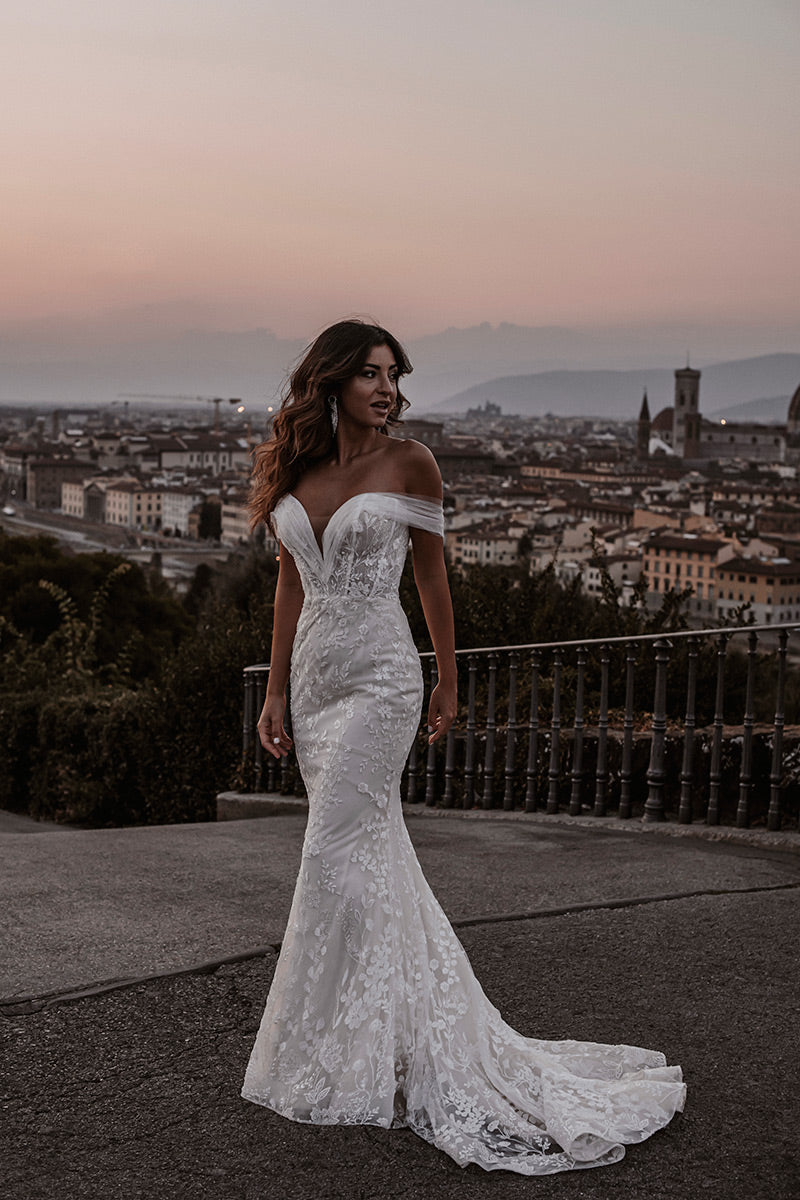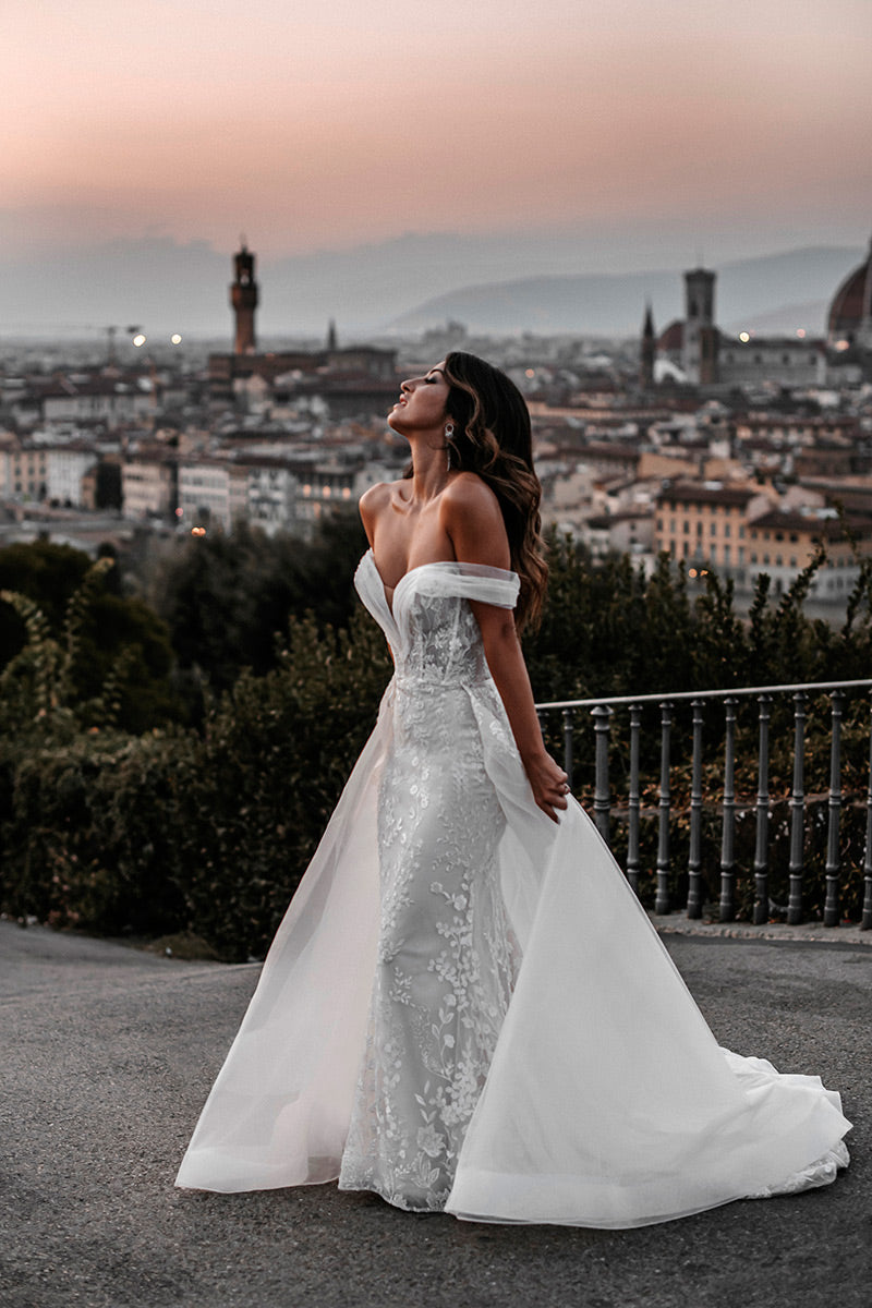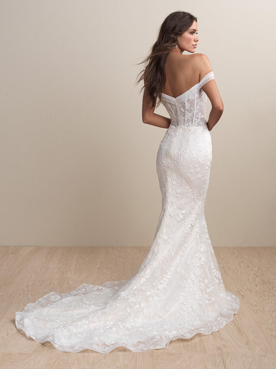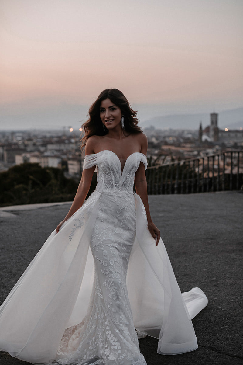 Sizes with an S are 4 inches shorter in length.The name of this style is HellenaHellena, a timeless sheath silhouette, features lovely beadwork and an elegant ruched off-shoulder strap, with a detachable train for added effect.Refer to measurements for Size Chart B