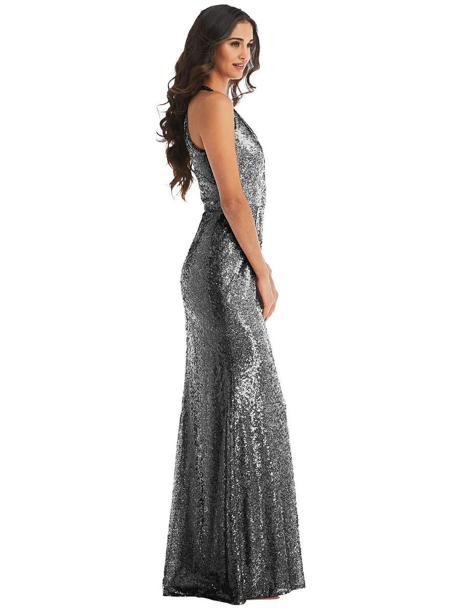 Halter Wrap Sequin Trumpet Gown with Front SlitDazzling full length v-neck halter sleeveless dress in an elle sequin fabric makes a stunning presentation for formal evening events. Open back. Classic trumpet skirt with slit gives revealing style.IMPORTANT INFORMATION REGARDING the "In Stock" indicator on this collectionWhen you see "In Stock" tagged on a style in this collection this indicates that we have this style/color/size in our store for you to see and that you can try it on if you visit our store. The dresses from this collection that are in our store are "Samples" and are not available for purchase.All style/sizes/colors in this collection must be special ordered and can usually be shipped in 9 weeks.