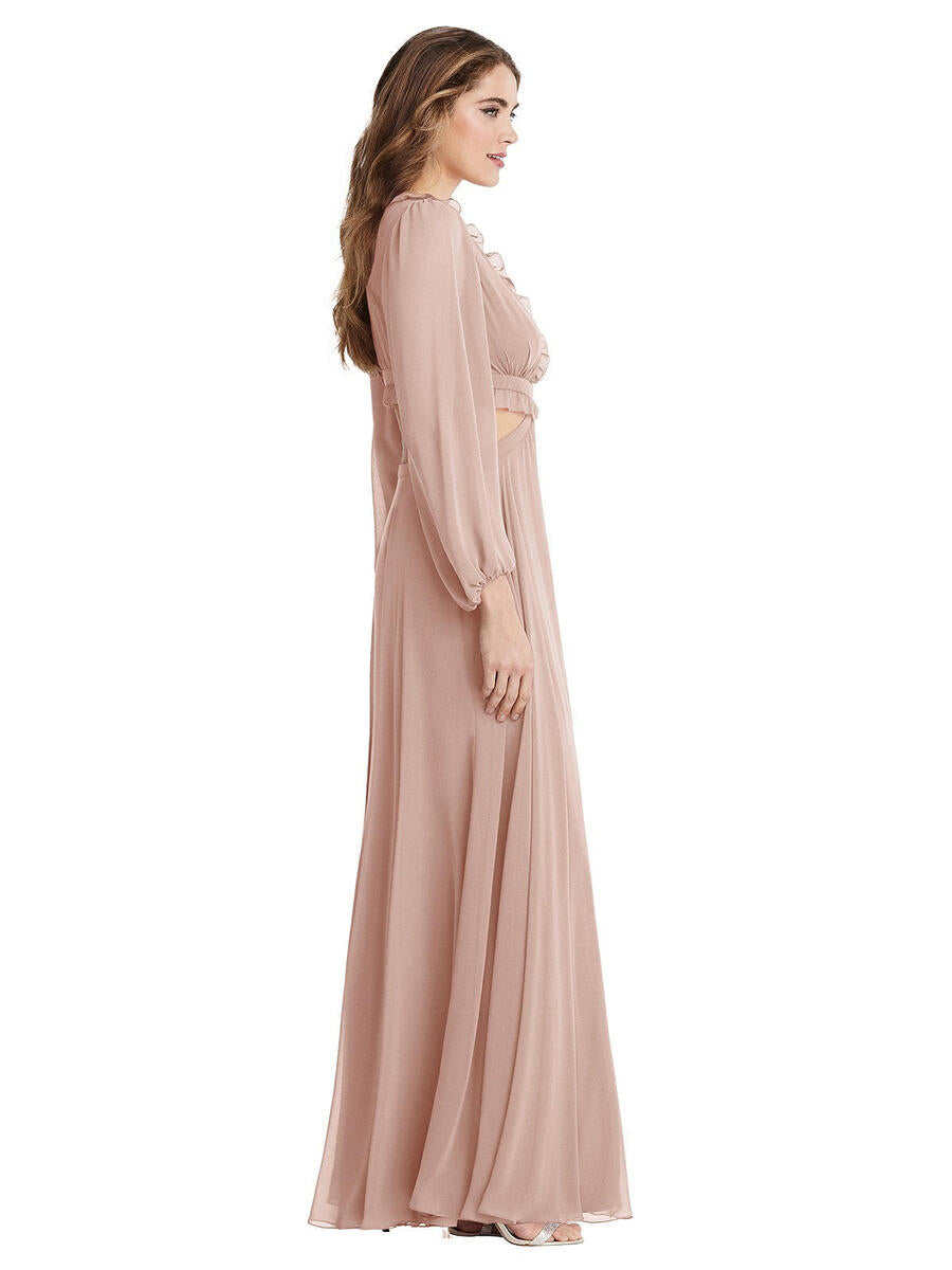 Bishop Sleeve Ruffled Chiffon Cutout Maxi Dress - Harlow Lux chiffon bishop sleeve maxi dress with ruffle detail at bodice and bikini style cups. Shirred skirt and exposed midriff. Covered button closure at back.IMPORTANT INFORMATION REGARDING the "In Stock" indicator on this collectionWhen you see "In Stock" tagged on a style in this collection this indicates that we have this style/color/size in our store for you to see and that you can try it on if you visit our store. The dresses from this collection that are in our store are "Samples" and are not available for purchase.All style/sizes/colors in this collection must be special ordered and can usually be shipped in 9 weeks.