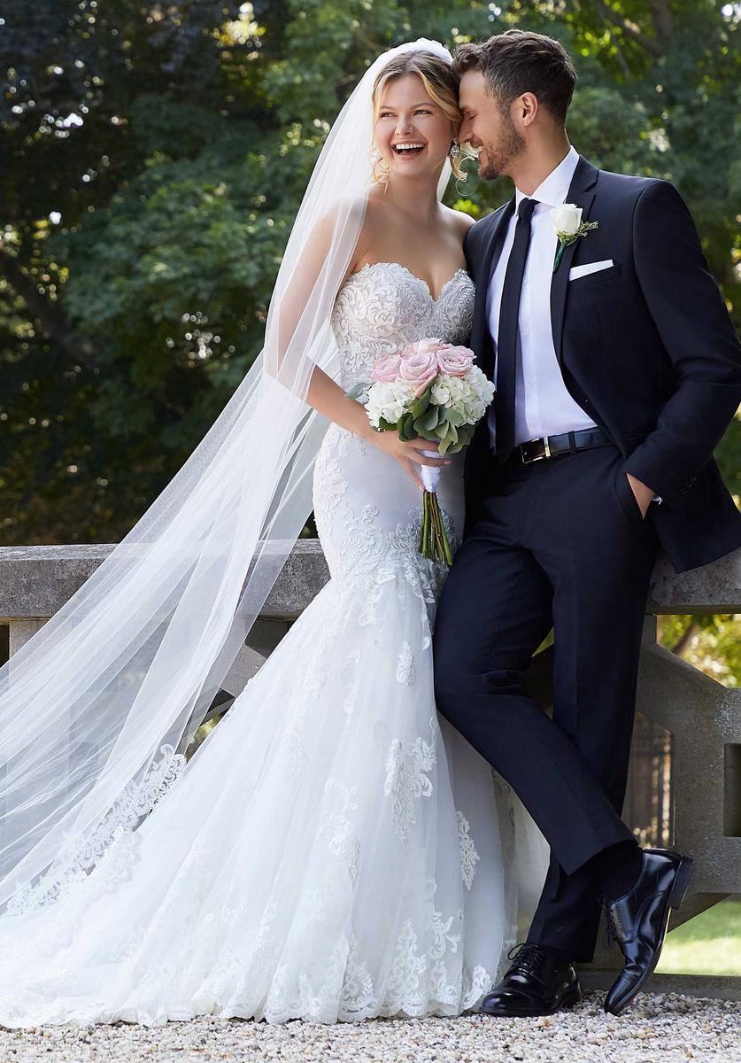 The name of this Morilee Wedding Dresses is Sonia. Frosted alenon lace appliques on a chantilly lace sweetheart bodice meets the fitted, satin body of our Sonia wedding dress. A tulle mermaid skirt with scalloped hemline and two-tiered train complete the look. Available in three lengths: 55", 58", 61". Available with front bodice lining as style 2144L. Styled with headpiece HP4046. Shown in Ivory/Candlelight.