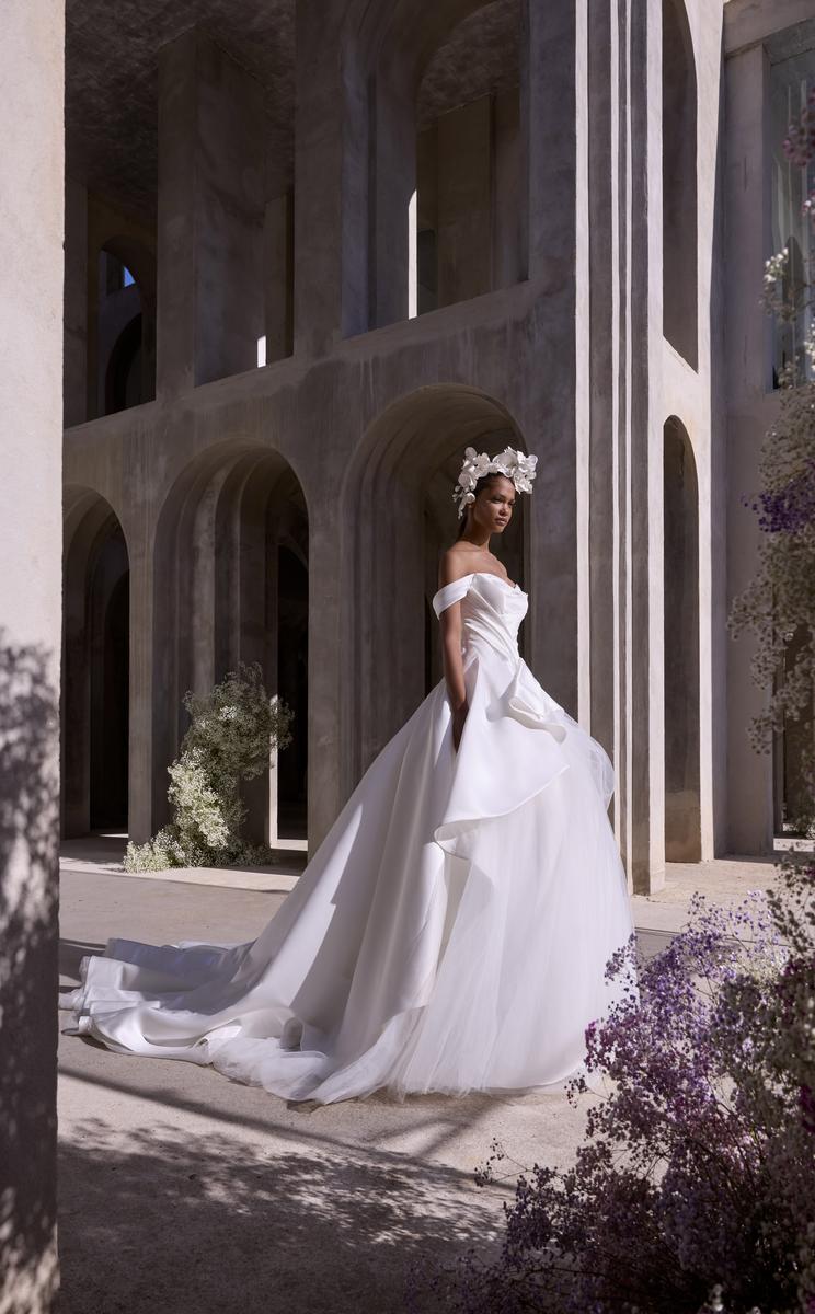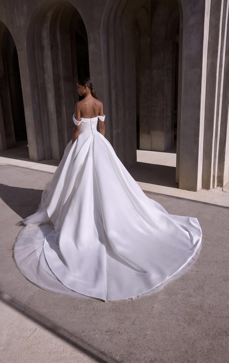 Sculptural drama meets timeless romance in our Nuwa wedding dress. The stylized draped bodice creates fluid movement that draws the eye down the ball gown silhouette, with detachable off-the-shoulder straps offer versatility. The tiered satin skirt brings volume and movementthis gown is bold, refined, and designed to command attention.