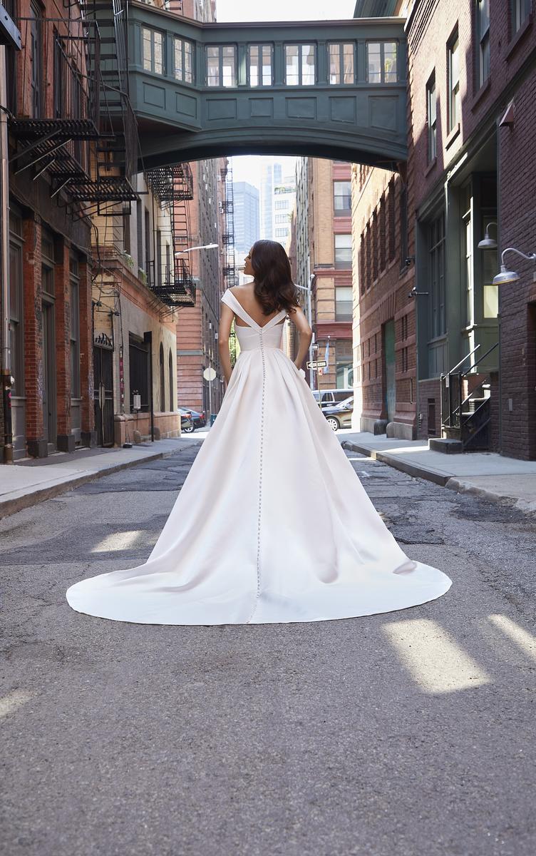 The name of this Morilee Blu Gown is JoanieModern meets classic in our Joanie designer wedding dress. The sleek satin A-line features a chic cuffed neckline on a surplice bodice with cap sleeves for a geometric look. The banded waist helps to cinch in your figure leading to a stunning pleated skirt. A matching v-shaped back is cool and contemporary with the traditional touch of buttons leading down to the hem. Shown in Ivory and Misty Blue.