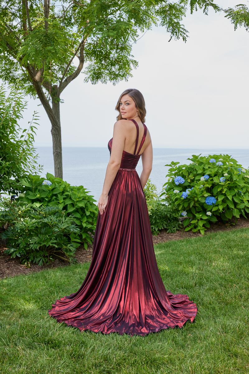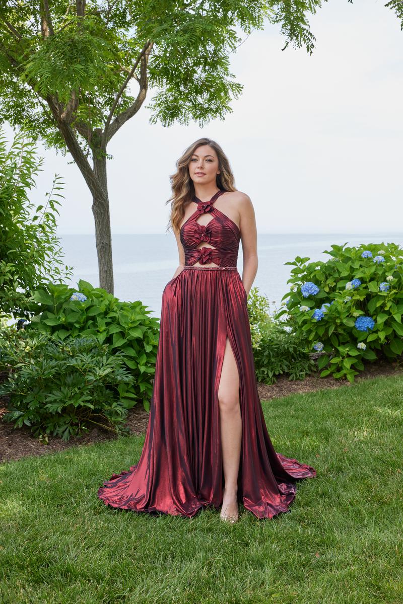 Unique A-line prom dress has a halter neckline and cut out bodice with 3D rosettes on a ruched foiled jersey full circle skirt.