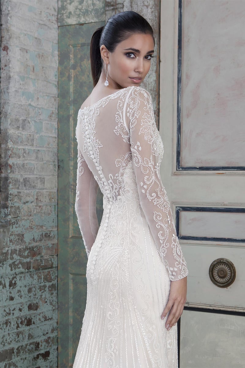 Fabric: Beaded tulle | Neckline: Sabrina | Waistline: None | Silhouette: Straight | Embellishments: Satin covered buttons, Buttons to the end of the zipper | Secondary Fabrics: Lining | Dress length: Floor | Train Length: Chapel | Sleeve Length: Long sleeve | Featuring: Illusion neckline, Illusion back, Illusion sleeves